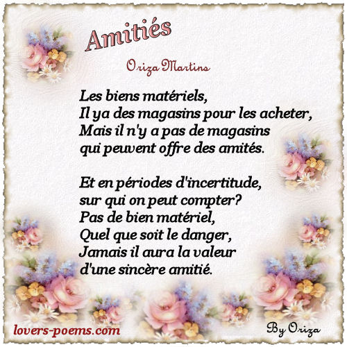 Poème d'amitié (en anglais) Publié le 6 décembre 07 par leselevesdesaintex Friends forever Friends are friends forever together 'till the end You promised me that you would always be my friend One day something changed I'm not sure what it was I lost you on that day and the reason was because. 1 Définition du poème en prose L’expression « poème en prose » est paradoxale puisqu’elle réunit deux termes qui s’opposent la prose, écriture libre, et la poésie, qui repose sur les contraintes du vers, des rythmes et des rimes Les deux, pourtant, se combinent en un genre créé dans la première moitié du XIX e siècle. Petits poèmes en prose Résumé et commentaires Parallèlement aux Fleurs du mal, Baudelaire entreprend de publier en revue de brefs poèmes en prose Le titre originel, Poèmes nocturnes, évoque l’atmosphère de Gaspard de la nuit, l’œuvre d’Aloysus Bertrand, dont s’inspire Baudelaire pour son ouvrage.