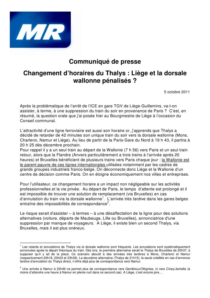 Changement D Horaires Du Thalys Liege Et La Dorsale Wallonne Penali