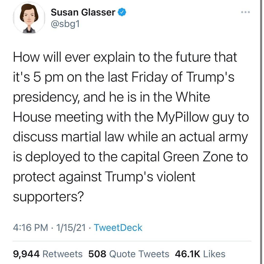 Jan 15, 21My Pillow Guy Urges Martial Law January 15, 21 at 618 pm EST By Taegan Goddard Leave a Comment MyPillow CEO Mike Lindell went to a meeting at the White House today with notes suggesting “martial law if necessary,” the Independent reports “The notes,.