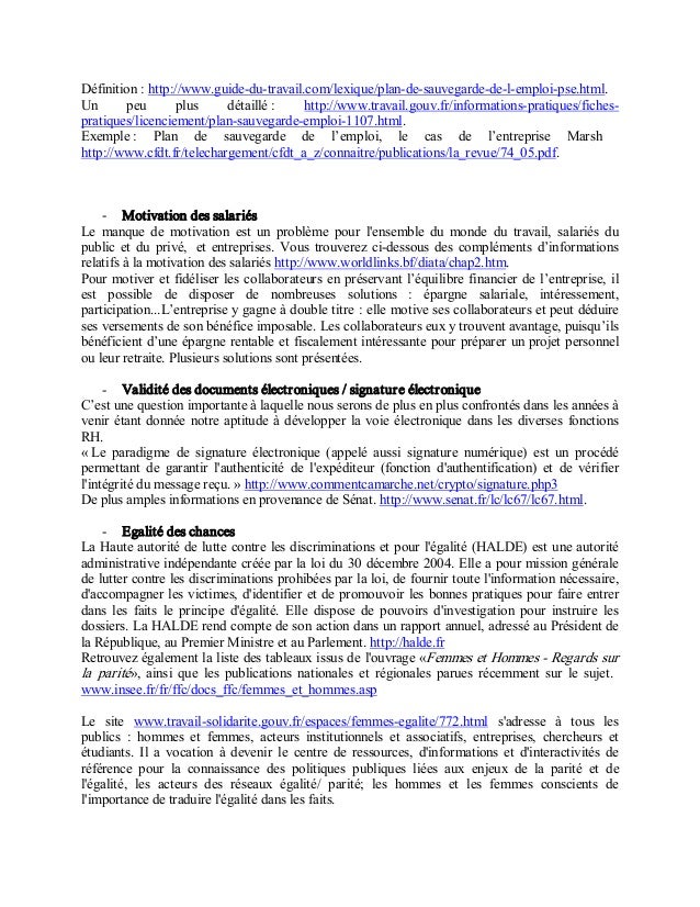 Plan de sauvegarde de l emploi exemple. Titre d'exemple, 41 salariés du site de VillersSaintPaul ont pu entrer dans le dispositif de préretraite choisie et 43 autres ont bénéficié des mesures du plan de sauvegarde de l'emploi pour la mobilité ou l'aide à la création ou la reprise d'entreprise coatexcom. Plan de sauvegarde de l'emploi Cours de 17 pages Droit du travail En France, le plan de sauvegarde de l'emploi, également connu sous son ancien nom de plan social ou sous le sigle PSE, est un dispositif visant à limiter les conséquences des licenciements collectifs, mis en place dans l'article L du code du travail Instauré. Dans une entreprise d'au moins 50 salariés, l'employeur est tenu d'établir et mettre en œuvre un PSE lorsque le projet de licenciement concerne au moins 10 salariés dans une même période de 30 jours (article L du Code du travail)De même, l'employeur devra proposer un PSE si.