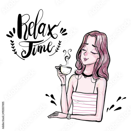 Beautiful Girl With Cup Of Coffee On White Background With Hand Drawn Relax Time Lettering Vector Illustration Buy This Stock Vector And Explore Similar Vectors At Adobe Stock Adobe Stock