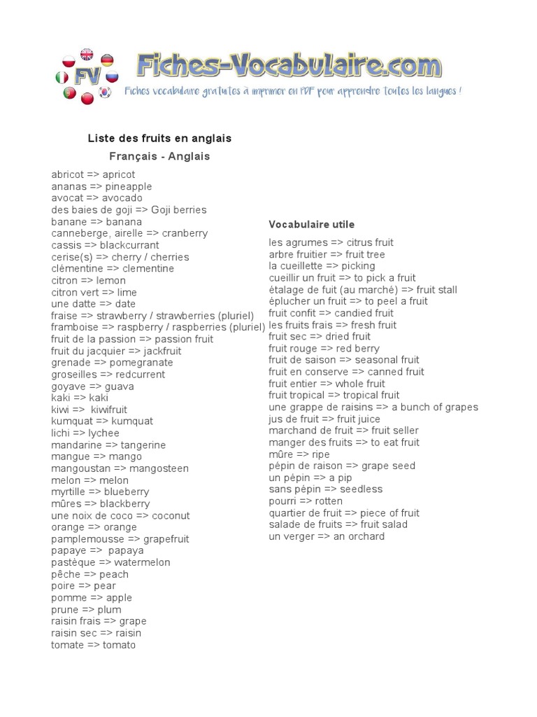 Liste vocabulaire anglais les fruits TÉLÉCHARGEZ EN UN CLIC LE PACK COMPLET 100 FICHES DE VOCABULAIRE ANGLAIS _ FRANÇAIS ANGLAIS un abricot an apricot un agrume a citrus fruit un ananas a pineapple un arbre fruitier a fruit tree un avocat an avocado un cassis blackcurrant un citron a lemon un citron vert a lime. Dialecte chinois parlé à Beijing et dans ces alentours. Cette brochure et la vidéo qui l'accompagne sont disponibles en anglais, en arabe, en mandarin, en thaï, en vietnamien, en russe et en tagal English 6 Also known as Mandarin more_vert open_in_new Lien vers la fruit salad and fresh bananas, oranges, grapes and melons should all be consumed when you're ill as they're a good source of.