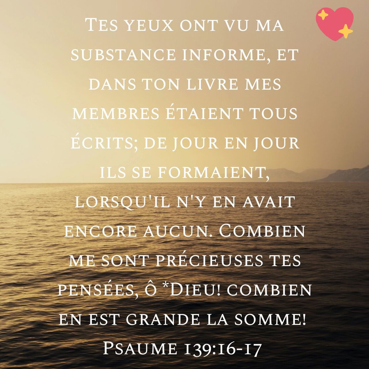 Les Psaumes 139 16 J Etais A Peine Forme Tu Me Voyais Deja Deja Tu Avais Ecrit Dans Ton Livre Le Nombre De Jours Que Tu Allais Me Donner Et Pourtant Aucun N Avait
