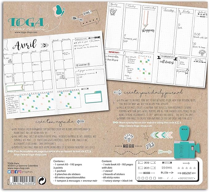 Draeger By Toga Kit Bullet Journal Kit Complet Pour Creer Son Premier Bullet Journal 1 Cahier A Petits Pois 1 Pochoir 2 Planches De Mini Stickers