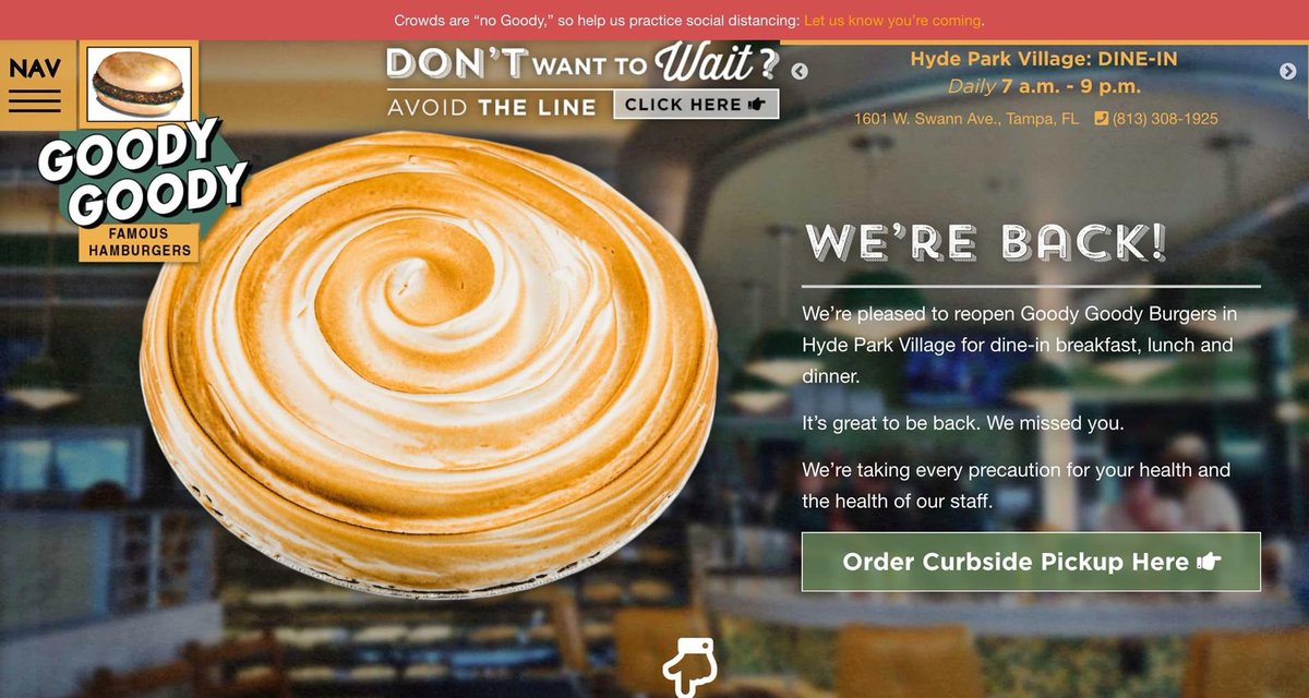 "Goody Goody restaurant in Tampa's Hyde Park Village reopened for dining on Thursday May from 7 am to 9 pm seven days a week Online touchfree takeout ordering and pickup at the restaurant is available from 8 am to 9 pm Customers pay and order online at GoodyG". Butterscotch at Goody Goody Burgers "Great for adults and ok for kids The bUrgers are really good I had the POX and was really happy with it My wife had the same, but with impossible burger and they did a good job with it Get the lime. It's Goody until gone You can also get it to go for curbside takeout by calling (813) Goody Goody is open 7 am to 9 pm daily in beautiful Hyde Park Village See More.