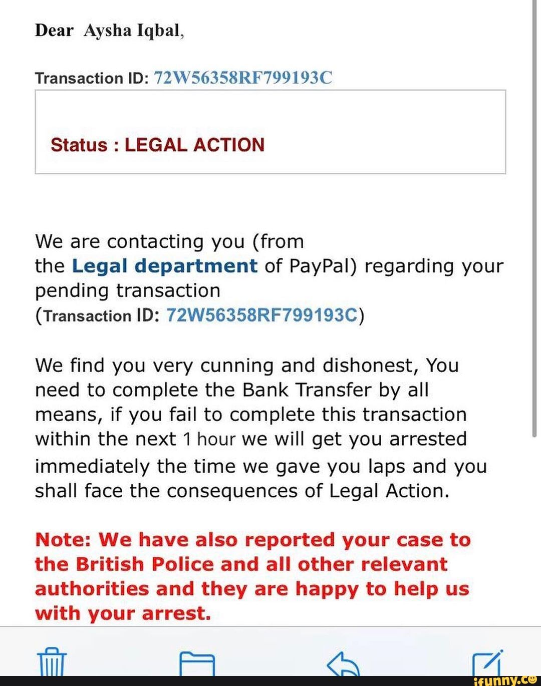 Dear Aysha Iqbal Transaction Id 72wrfc Status Legal Action We Are Contacting You From The Legal Department Of Paypal Regarding Your Pending Transaction Transaction Id 72wrfc We Find You Very Cunning