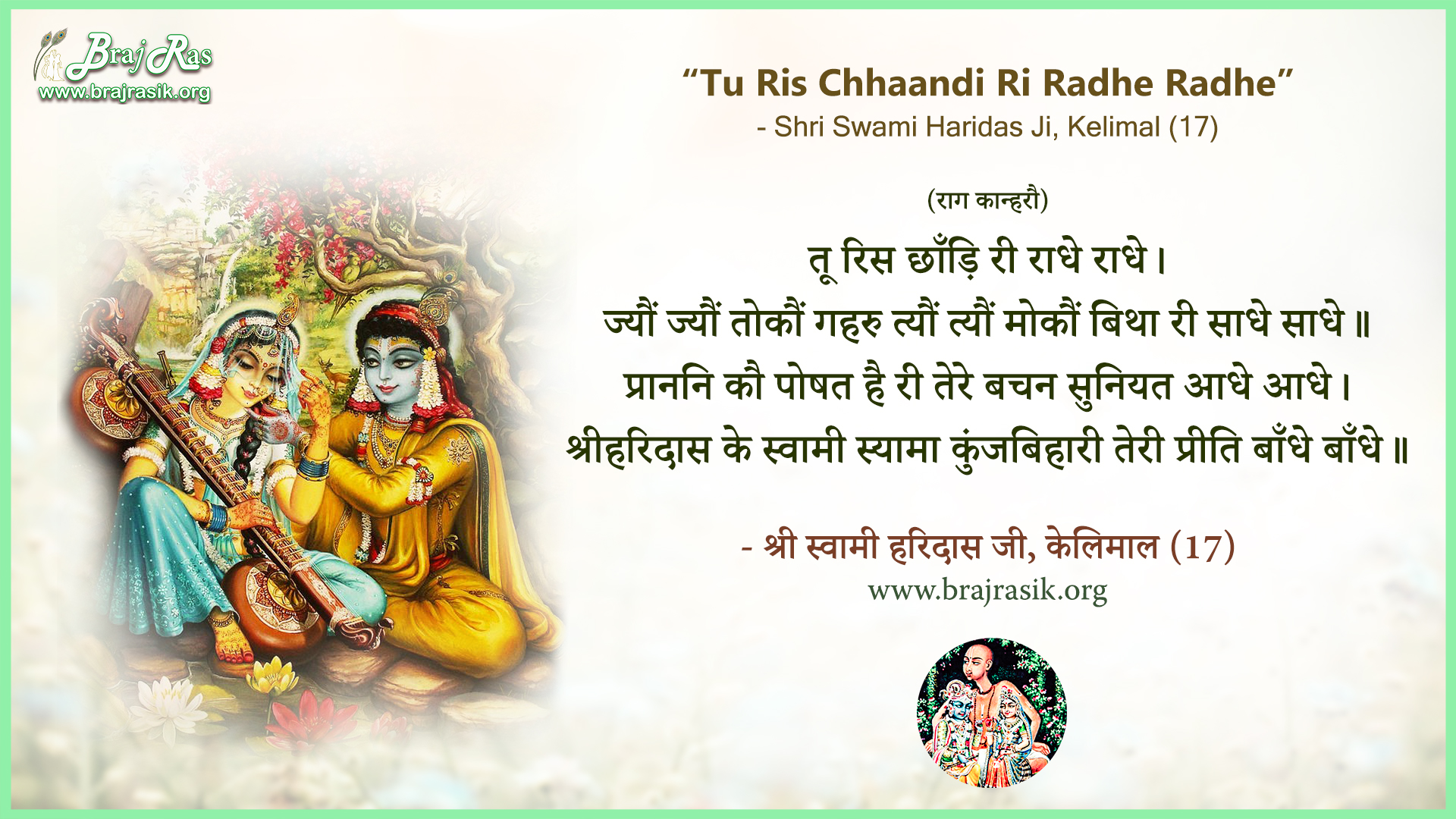 Tu Ris Chhaandi Ri Radhe Radhe Shri Swami Haridas Ji Kelimal 17
