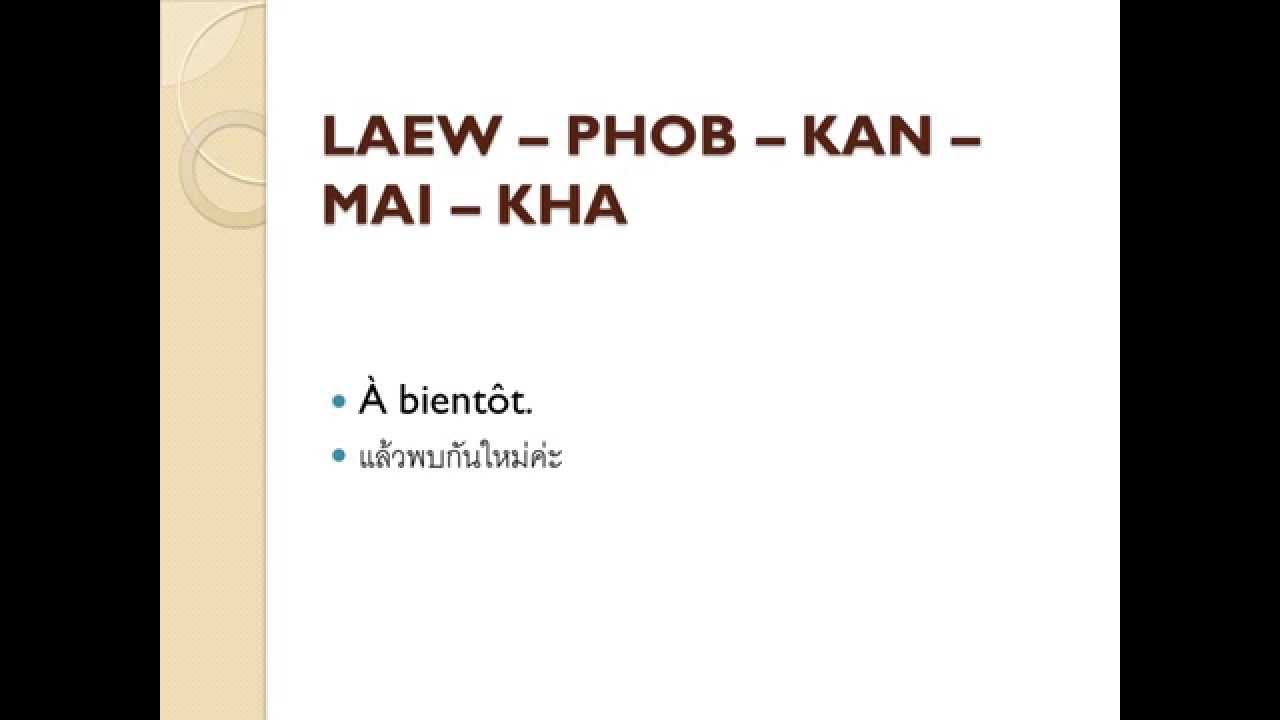 Merci beaucoup en thailandais Traduction d'un mot thailandais en français ou anglais Estce que quelqu'un pourrait me traduire ce mot thai, en français ou en anglais, dans ses propres mots, donc sans utiliser google translate?Merci afin que nous Te glorifions beaucoup, Thaï เพื่อเราจักได้ถวายการแซ่ซร้องสดุดีต่อ. Merci (Femme) Khop khoen kha (Homme) Khop khoen krab Je suis content de vous voir Die tsjaaj tie daaj phob khoen Je suis content que vous ayez pu venir (Femme) Tsjan die tsjaai tie khoen maa (Homme) Phom die tsjaai tie khoen maa Bienvenue Jin die toon rab FILMS ON THE INTERNET HOW TO GREET. Joyeux Anniversaire en Thailandais Souksan wan keut;.