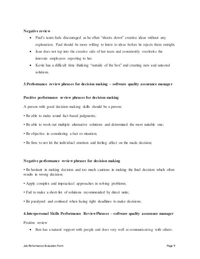 AdEffortless QA management with TestRail™ Flexible, rich &. Jul 10, A selfevaluation is an important part of a yearly performance appraisal, and is necessary so that the employer can understand how an employee perceives her/himself within the organization So that you can reflect a positive attitude that is ready to embrace change, here are some selfevaluation performance phrases that you may use. Aug 17, 17Here is a compilation of selfevaluation phrases to help you complete your performance review and receive the high marks you deserveFind the right combination of phrases to describe yourself and speed up your performance review paperwork Own them!.