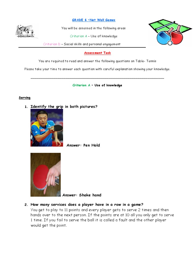 Grade 6 Net Wall Games Table Tennis Racquet Sports