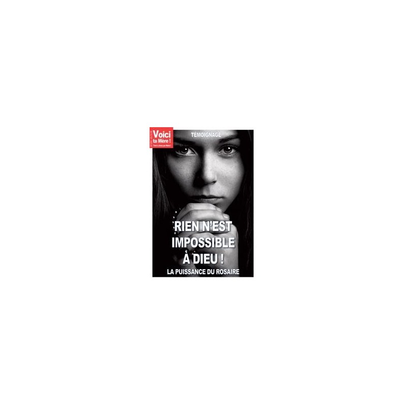 Voici ta Mère !. V o i c t a M è r e!C N ° 7 0° P r i x 3, 0 0 € I S S N 1 9 5 92 7 1 XP P A P N 1 1 1 8 G 9 1 1 2 0 RIEN N’EST IMPOSSIBLE À DIEU !. Je vous encourage à garder cet espoir que rien n'est impossible à Dieu aucun foyer brisé ne le rebute, aucun mariage fragile ne l'est trop pour lui Avec Dieu, ce n'est jamais terminé Voici sa promesse pour ses enfants "Ils reconstruiront sur d'anciennes ruines, ils relèveront les décombres du passé, ils rénoveront des villes.